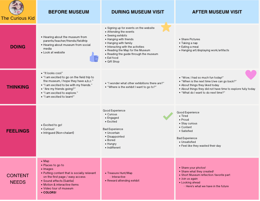 For our target user, we created a journey map to understand how the website fits with their visiting experience and determine content to support that journey.