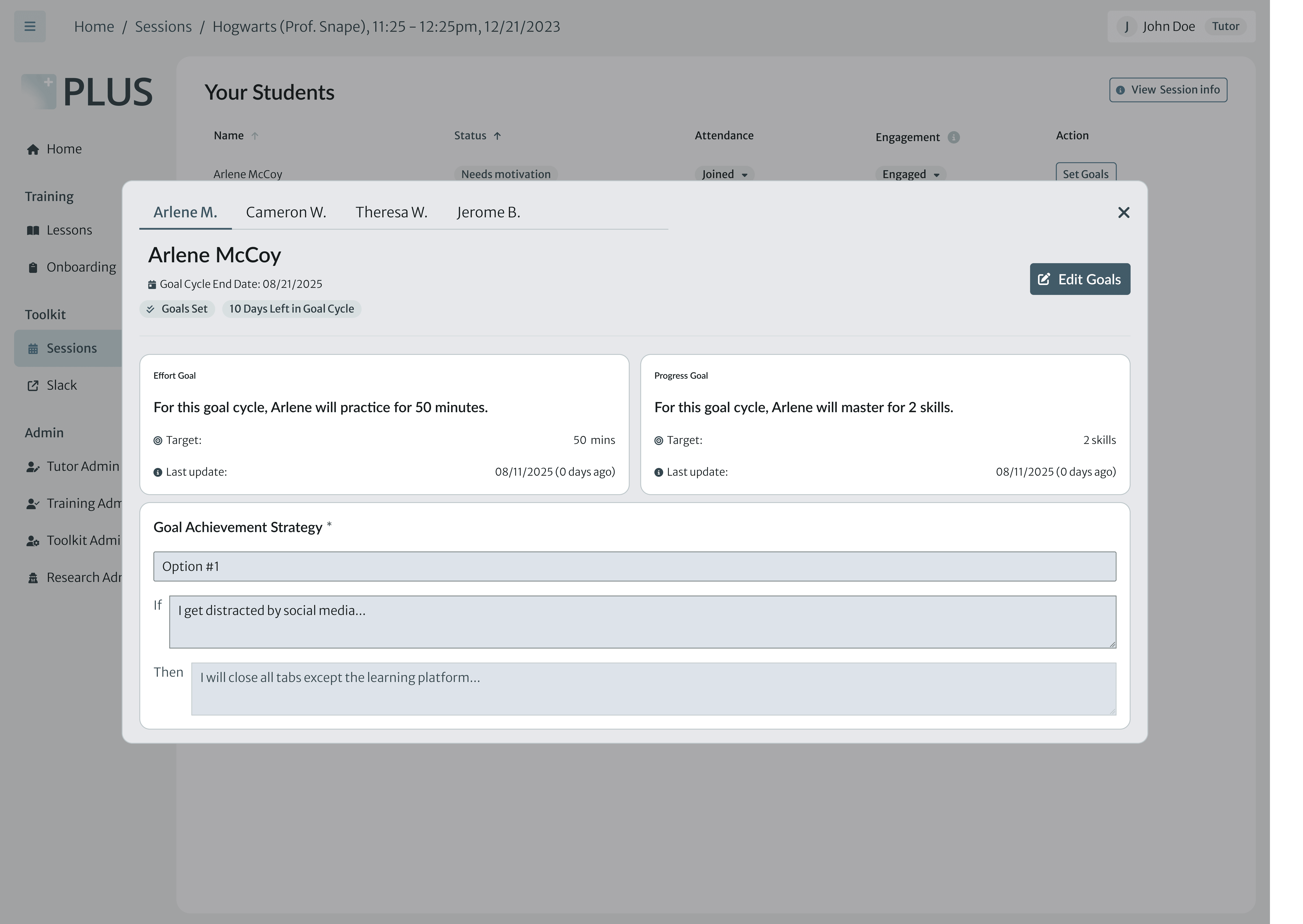 Distinct labels and badges for each goal scenario (create, view, or update), so tutors know exactly what action to take during the live sesion,